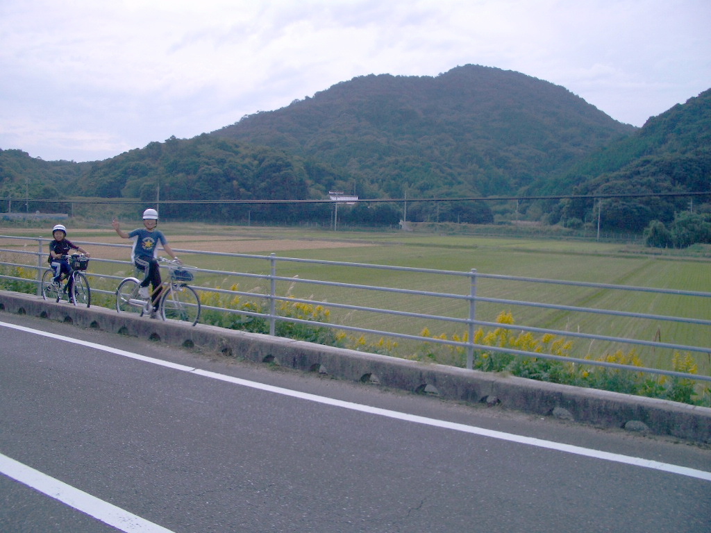 時折、反対車線をすれ違うヘルメットを被った地元の子供達が
