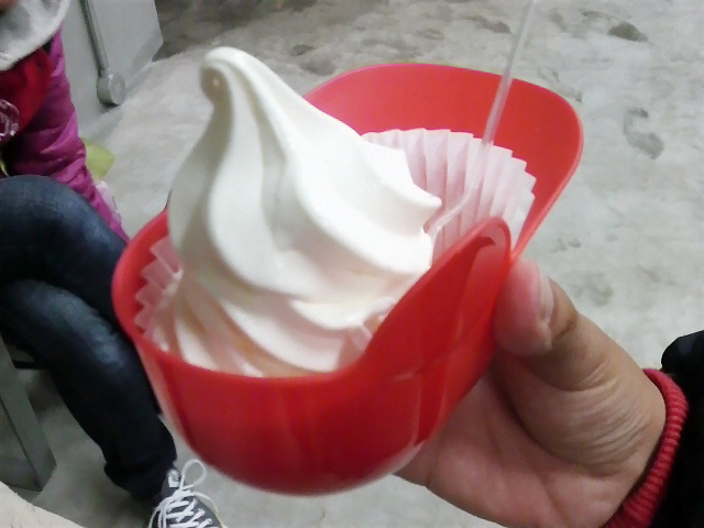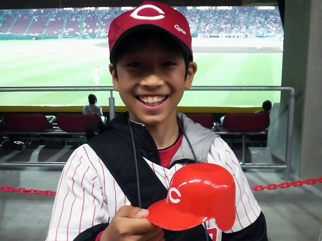 手にしてるのは、カープヘルメットのカップに入ったソフトクリーム