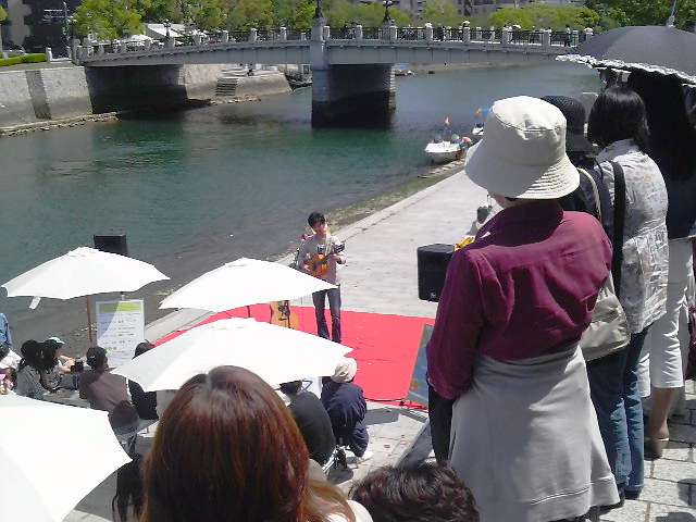 昨日、晩飯を一緒に食いながら、原爆ドーム対岸親水テラスで「水の都ひろしま」水辺のコンサートで唄うっていう話しを聞いてたので、ちょいと自転車に乗って、ケンタくんの綺麗な歌声を聴きに行ってきました。。