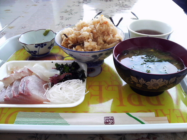 お刺身にチヌの味噌汁、そしてご飯は松茸・牡蠣・ホタテ・チヌの四種類食べ放題