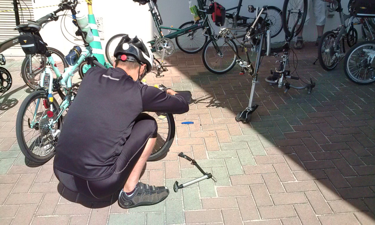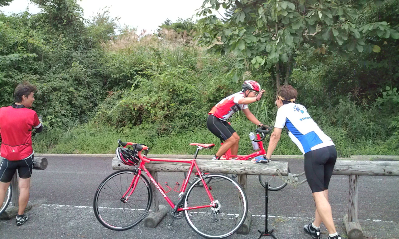 駐輪場に戻り、さあ、第一班、出発進行~!と思いきや、師匠のタイヤがパンク。。