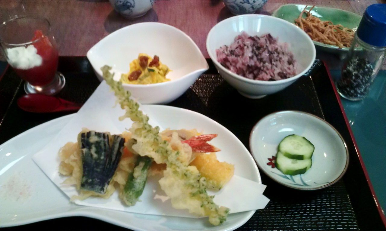 もりそば(¥600)にプラスして、天ぷら・古代米(もしくは、いなり)・毎回替わるおかず・デザートのセットです。