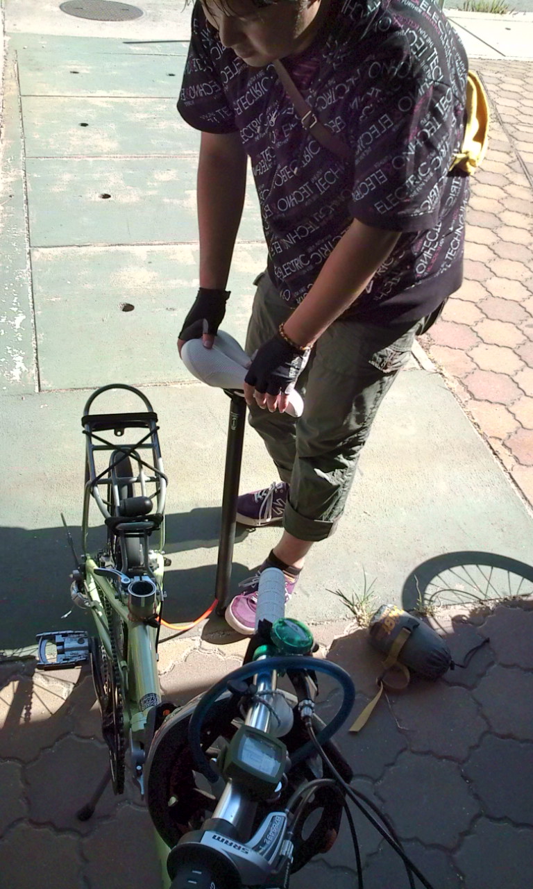 ここで、まこちゃんがDAHONオリジナルのシートポスト空気入れを実演。